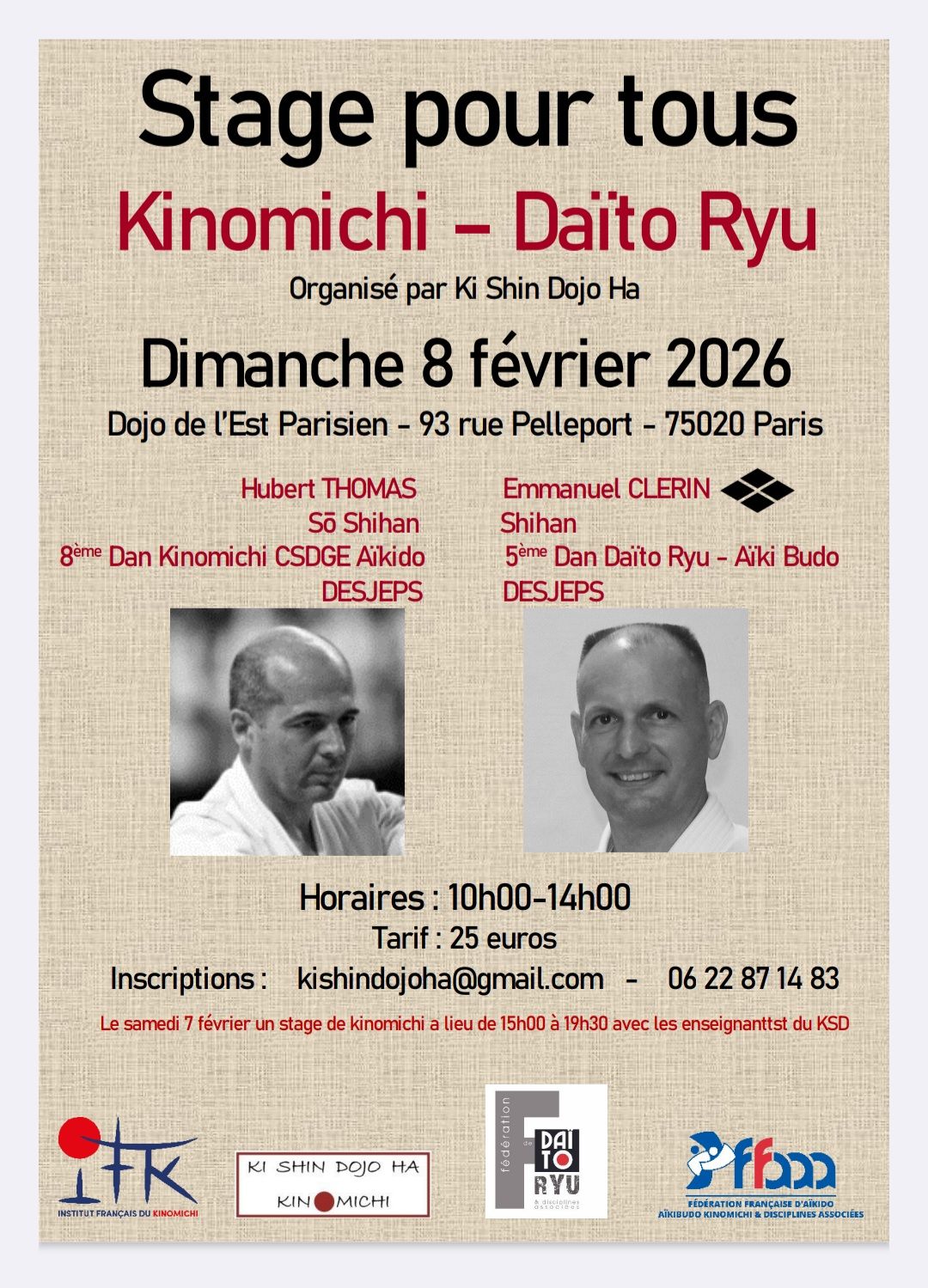 Formations récentes AIKIDO KINOMICHI Les évènements passés qui vont être renouvelés PARISKAGAMI BIRAKI FFAAA LE 3 FÉVRIER 2024 17H MAISON DU JUDO PARIS FORMATION INTERNATIONAL KISHIN RYUKINOMICHIpour 2, 3, 4, 5ème DAN avec HUBERT THOMASLE 4 FÉVRIER 2024 DE 9H à 13h Dojo ESt Parisien Pelleport Paris 20ème FRANCE SHIBU TAIKAI DNBK WE 10 et 11 février 2024 Renseignements : contact@lavoieduki.fr WBS2023 CLASSICAL MARTIAL ARTS Japon du 24 avril au 1er mai 2023KYOTO World Butoku Sai WBS2023 avec trois démonstrations au programmeRemerciements à la vingtaine de gradés Européens qui sont venus au Japon malgré les contraintes dues notamment à la période Covid.